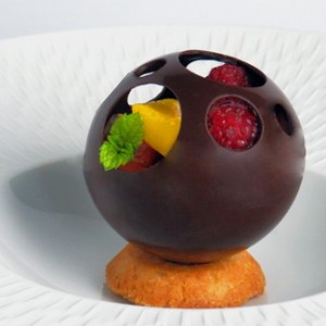 dessert Chocolaterie - sphère en chocolat ajourée et garnie de fruitsGateau2tarte-fraiseyonoseP3290258